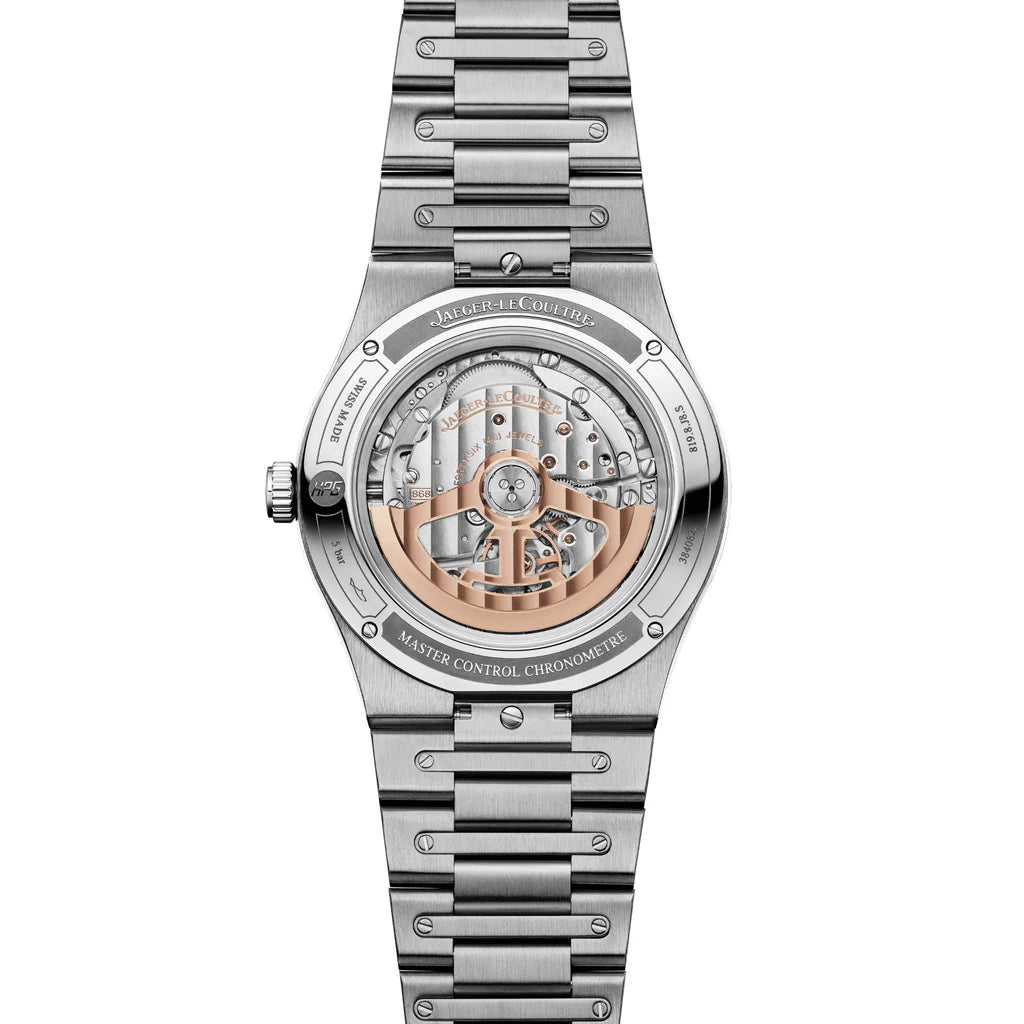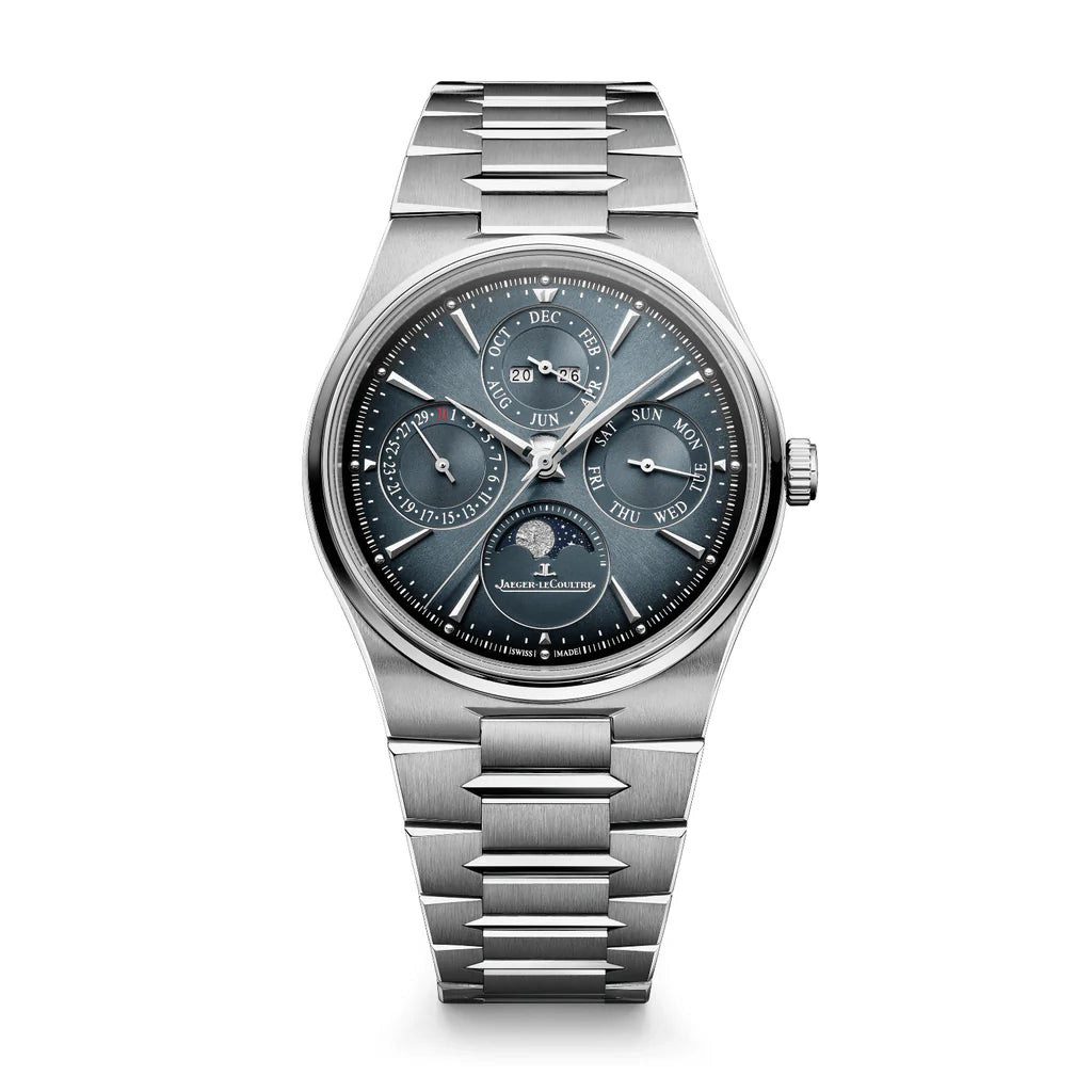 The Master Control Chronometre Perpetual Calendar embodies sophisticated elegance. Crafted in stainless steel, this timepiece features a refined 39mm case, measuring a slender 9.2mm thick, complemented by a seamlessly integrated metal bracelet with brushed and polished finishes. Its captivating blue-grey gradient sunray-brushed dial is distinguished by a legible perpetual calendar display, presented across four meticulously arranged sub-dials. These counters elegantly indicate the year, month, day, and date, alongside a moon phase indication at 6 o'clock, where the moon glows with hammered gold leaf, all enhanced by opaline and azuré finishes. Powered by the ultra-thin Manufacture Calibre 868, it boasts a 70-hour power reserve and ensures a precision certified by the Jaeger-LeCoultre HPG Seal which completes COSC standards by testing the entire cased-up watch in real-life wear conditions.