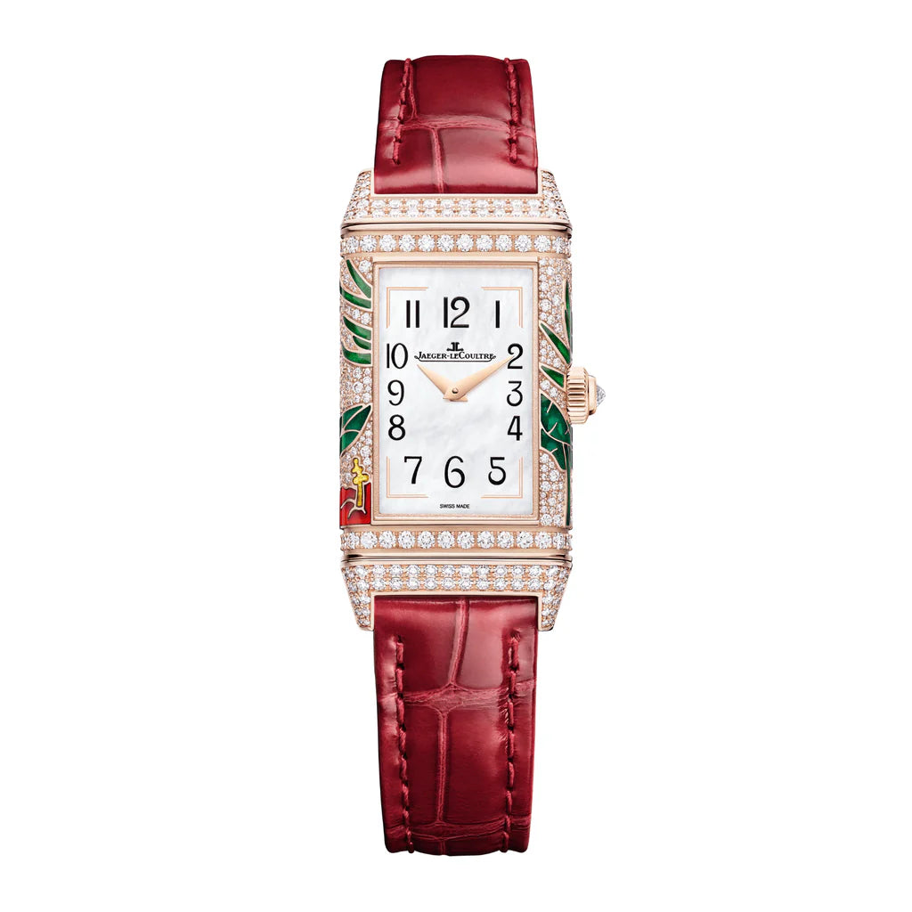 The Jaeger-LeCoultre Reverso One 'Hibiscus Rosa' showcases exquisite Grand Feu champlevé enamel work adorned with paillonnage and 645 diamonds totaling approximately 2.37 carats. This iconic reversible timepiece features a refined 40 mm x 20 mm x 9.09 mm case powered by the manually wound Calibre 846 movement. Paired with a luxurious red alligator strap, it offers 30m water resistance—a masterpiece of horological artistry and timeless elegance.
