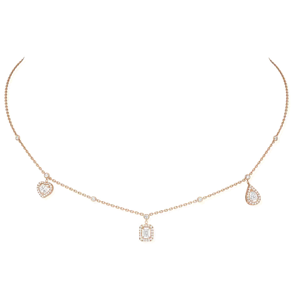 Three drop pendants, three diamonds: the My Twin Trio diamond necklace in pink gold plays on shapes with three heart, emerald and pear-cut diamonds. This original and precious piece of jewelry stands the test of time thanks to the eternal elegance of its diamonds and also adds a touch of luxury to any outfit. A fashionable and elegant piece that will go perfectly with your other Messika diamond jewelry.