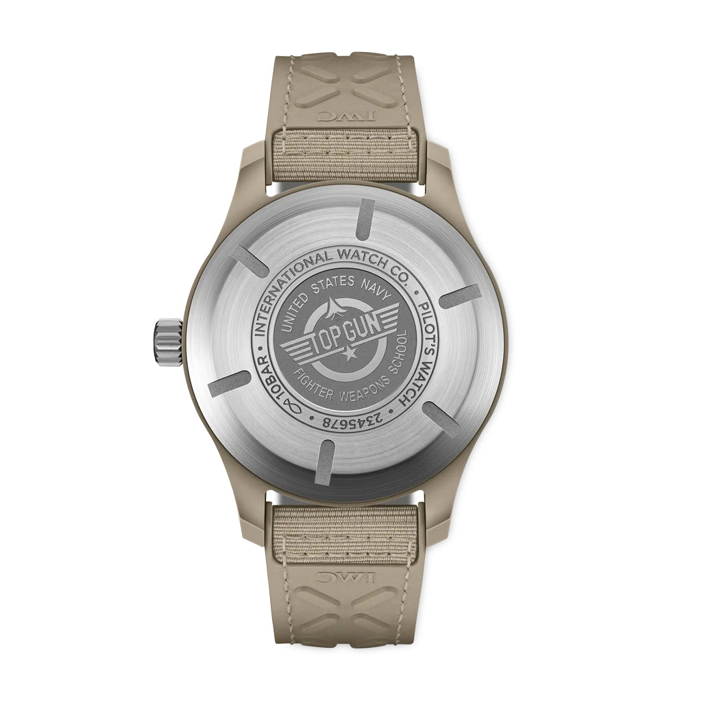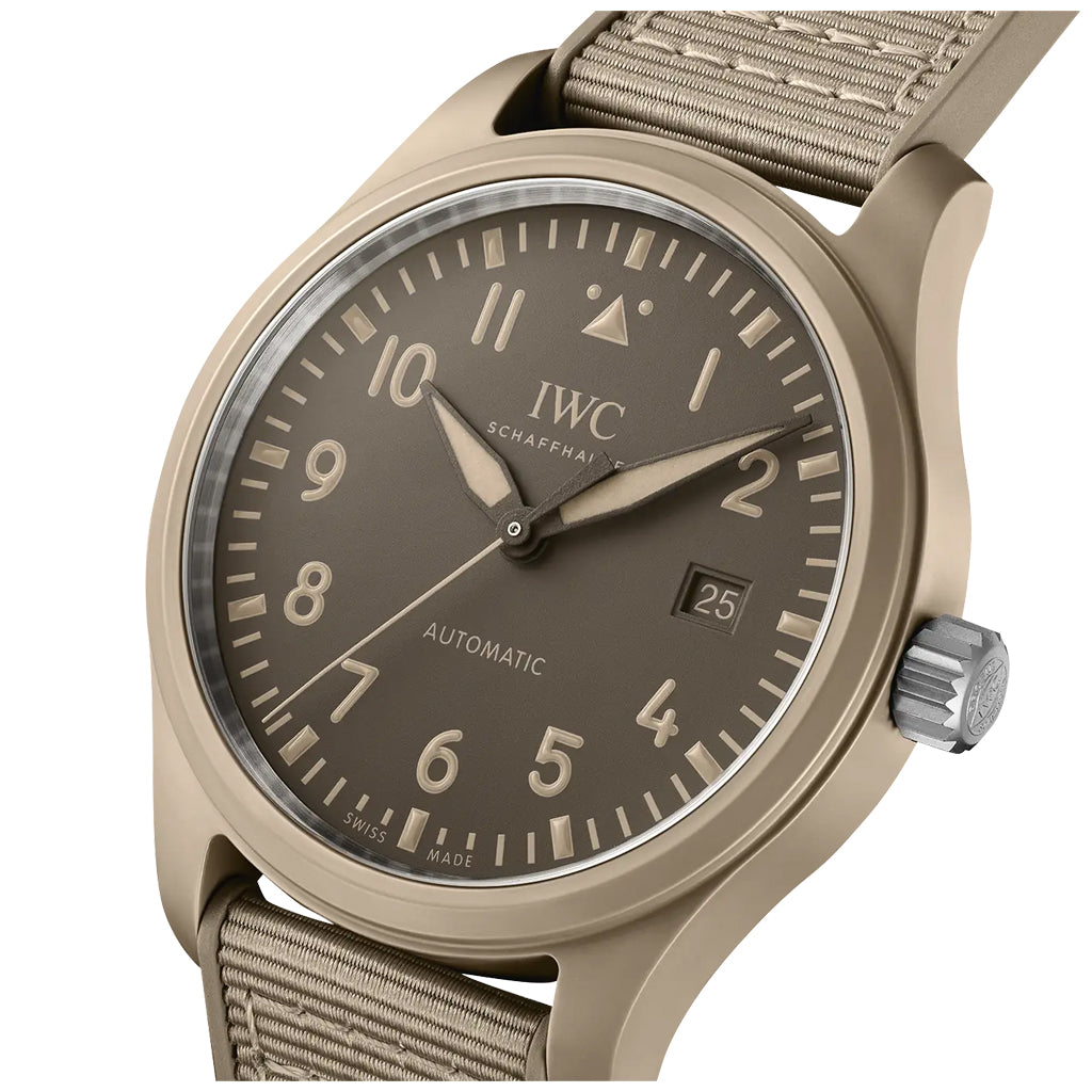 The Pilot’s Watch Automatic 41 TOP GUN Mojave Desert sports a sand-colored ceramic case and a subdued brown dial.