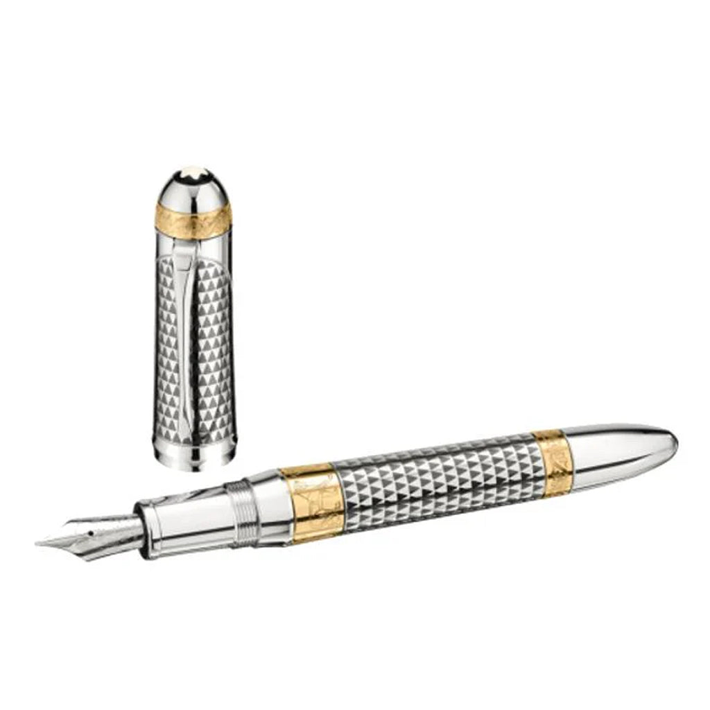 About This MontBlanc Pen: Baron Max von Oppenheim’s life was filled with a passion for exploring and discovery, for beauty and the fascination of the Middle East. To honour a man who roamed from Europe to the East the design of the Limited Edition Max von Oppenheim is inspired by the domes of Eastern mosques. Pale grey lacquer inlays on the barrel, made of 925 sterling silver, are reminiscent to the decoration and frescoes of the Middle East while the fountain pen’s platinum-plated rings recall the famous designs and reliefs from Tell Halaf. The limited Edition Patron of Art Max von Oppenheim is crowned by the white Montblanc emblem and embellished with a finely engraved Bedouin motif on the rhodium-plated 18 K gold nib.