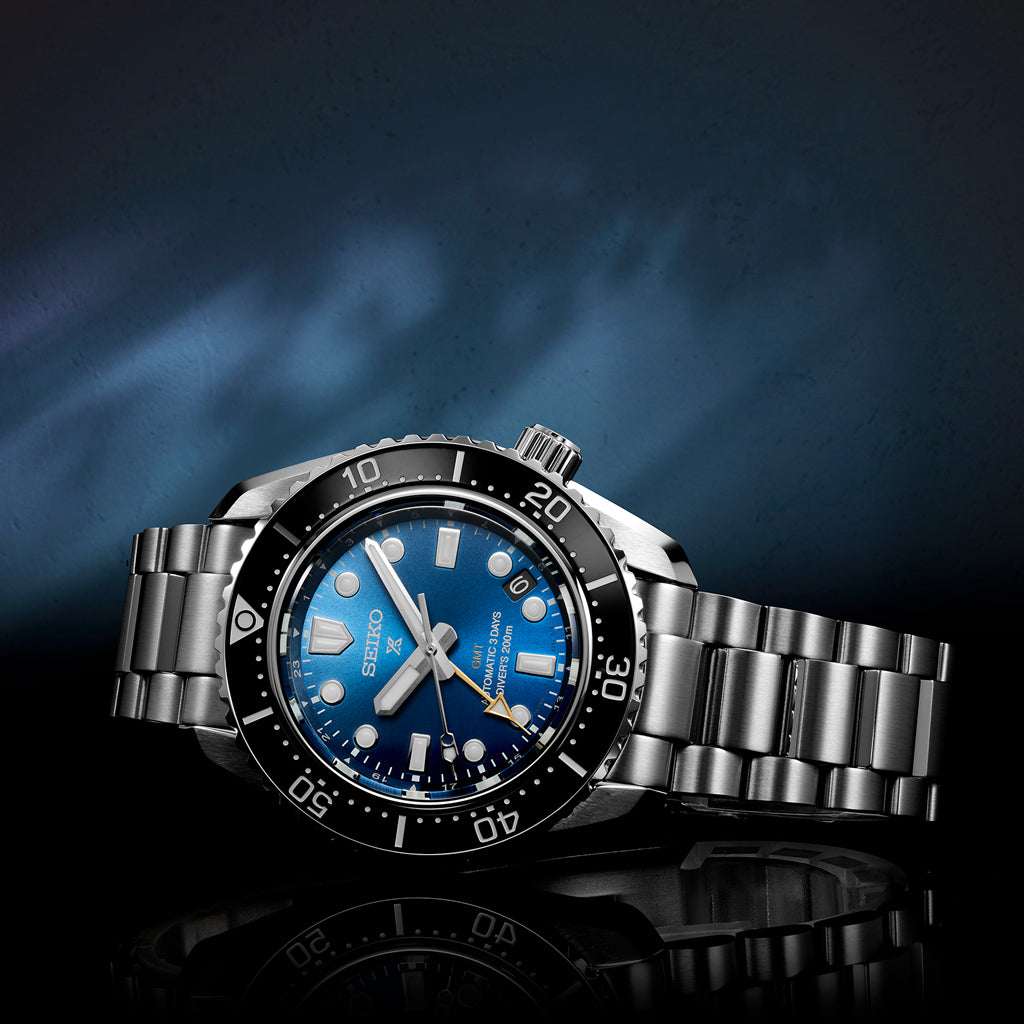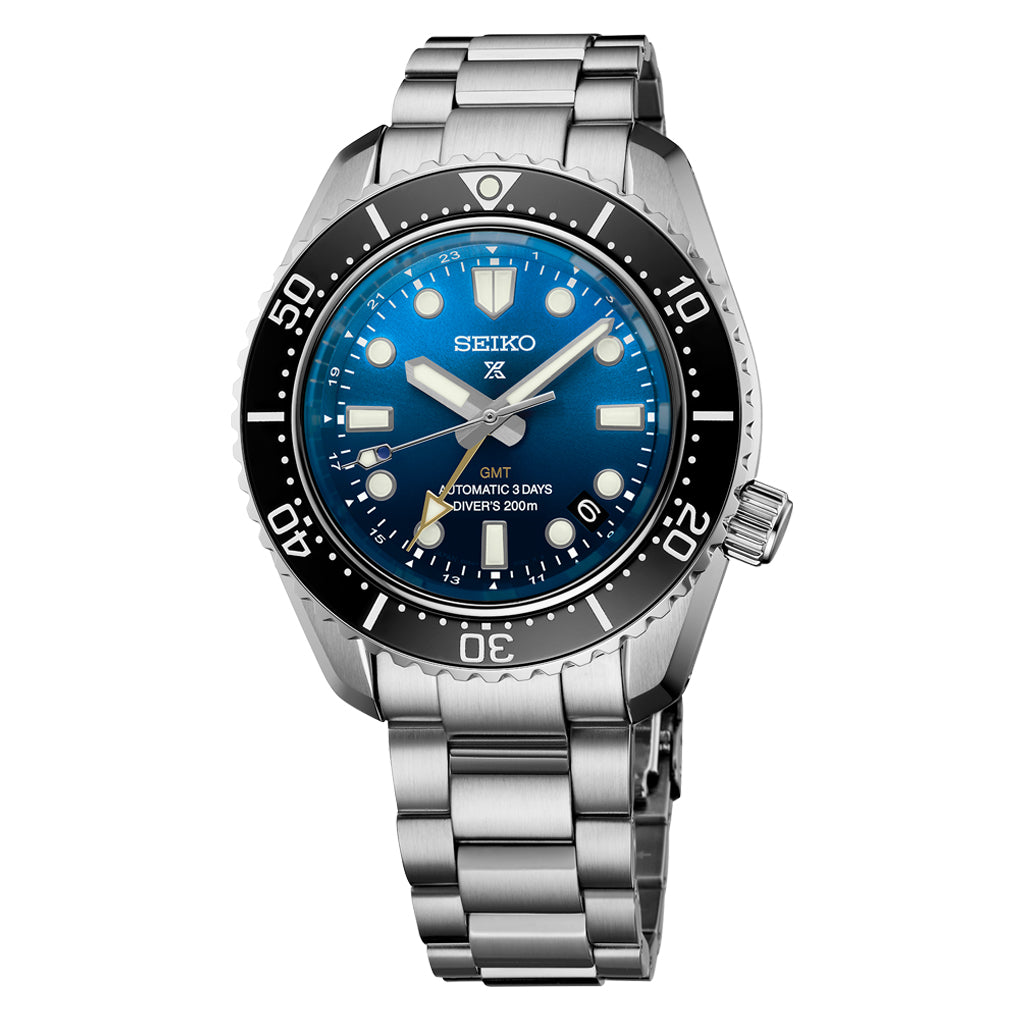 1968 Heritage Diver’s GMT U.S. Limited Edition. Designed for those who treat life as the ultimate adventure, the Seiko Prospex line meets every challenge with technological excellence and style. This extraordinary timepiece, available in a controlled production run of 500 pieces, honors Seiko’s landmark 1968 Diver’s Watch and showcases the brand’s first mechanical GMT movement created for diving, caliber 6R54. Extending the theme of duality with functionality in the sea and on land, the dramatic vertically gradated dial reflects the view from above and below the water. Providing a power reserve of approximately 72 hours, the longest of any Seiko mechanical watch, this 24-jewel automatic GMT movement beats at a frequency of 21,600 vibrations per hour and offers manual winding capability. The GMT hand can be set independently in one-hour increments, without interrupting the time-of-day hands, to provide a second time zone reading at a glance. Framed by a Made-in-Japan black ceramic uni-directional rotating elapsed timing bezel with a knurled edge for enhanced operability, the rich blue dial features a date calendar, gold GMT hand, and large LumiBrite markers and hands for enhanced legibility. Crafted of stainless steel with super-hard coating and following ISO standards for scuba diving to depths of 200 meters, this superbly functional timepiece includes an anti-reflective sapphire crystal, screwdown crown and caseback, three-link slim profile bracelet, and a tri-fold push button release clasp with secure lock and extender. 200m Water Resistant