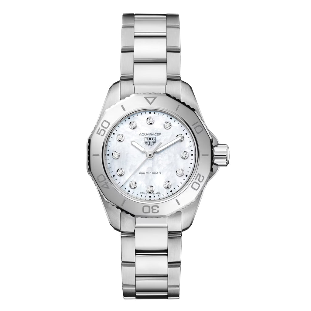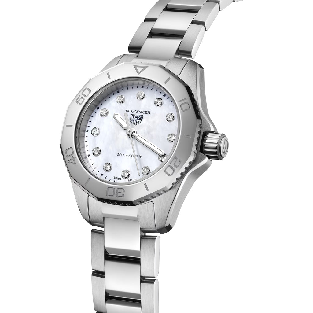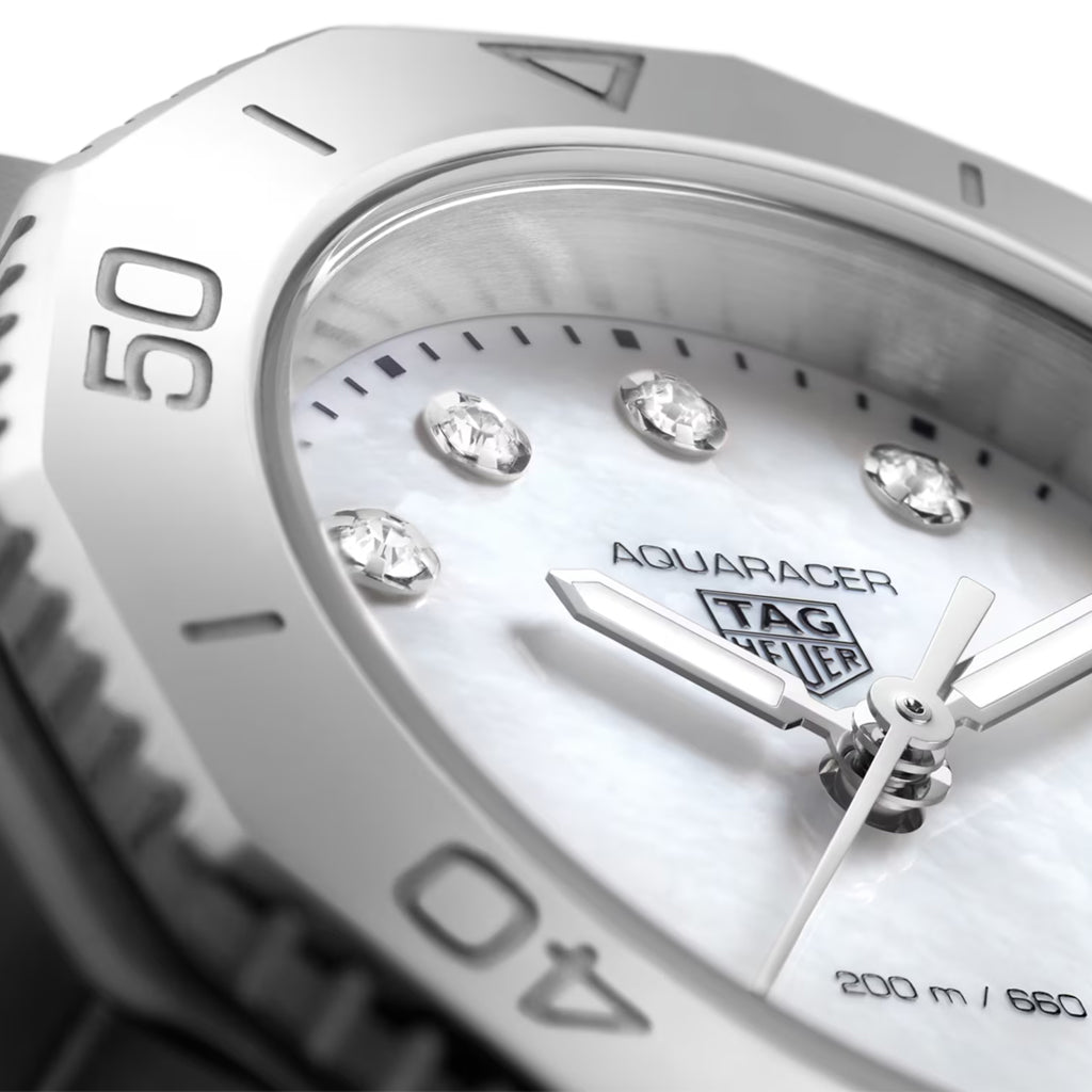 This TAG Heuer Aquaracer adds some sparkle to the versatile everyday companion. In addition to the diamond hour markers on of this 30mm watch, the dial itself is made from mother of pearl. A perfect incentive for going beyond the limits.