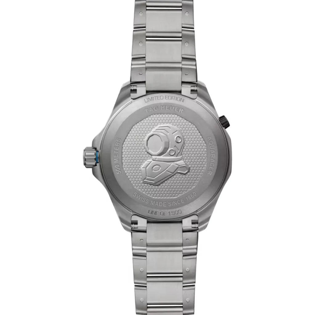Built to thrive under pressure, the TAG Heuer Aquaracer Professional 500 Date redefines diving performance with 500-meter water resistance and an ultra-light grade 2 titanium 42mm case. Powered by the COSC-certified Calibre TH30-00, it embodies TAG Heuer’s enduring commitment to precision and reliability in the most extreme environments. The striking black gradient lacquered dial adds visual depth, while the hands and indexes coated in white Super-LumiNova® guarantee instant legibility. The blue lacquered central hand brings a flash of color to ensure clear distinction underwater, and the 6 o’clock date magnifier ensures functionality with clarity.Equipped with the Calibre TH30-00, the timepiece delivers unwavering precision for divers who demand absolute performance. Its helium escape valve, crafted from black DLC sandblasted grade 2 titanium, regulates internal pressure during saturation diving, ensuring the case remains uncompromised. The black DLC sandblasted finished bezel with a black polished ceramic insert and blue quarter markings offers secure, intuitive handling.The sandblasted grade 2 titanium bracelet with an extension link ensures a secure fit over a wetsuit during deep-sea exploration and exceptional comfort on land. Its robust folding clasp with double safety push-buttons ensures stability in any condition.