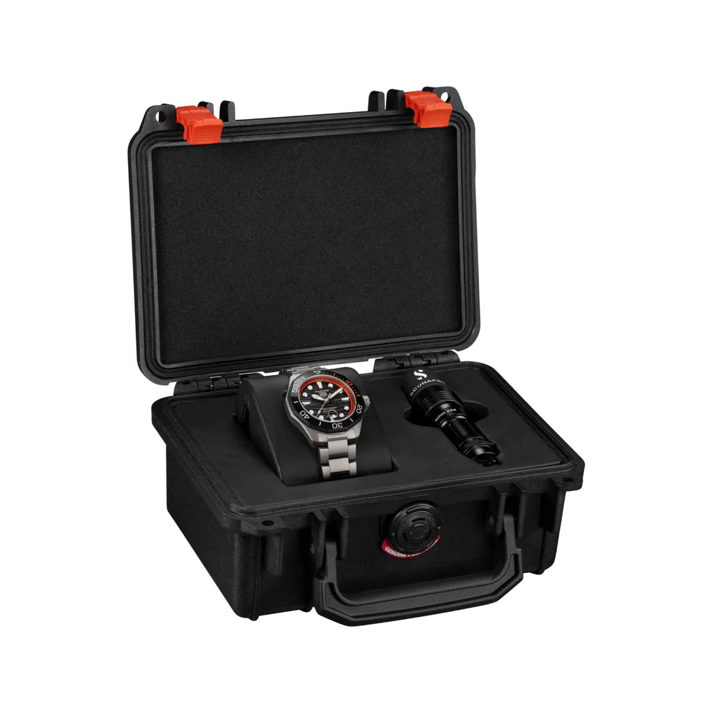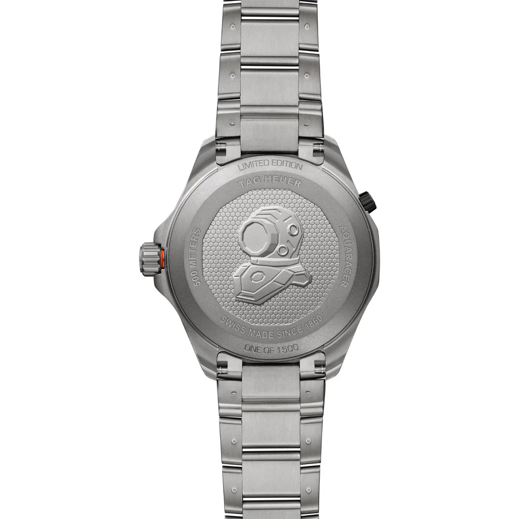 A fearless expression of diving excellence, the TAG Heuer Aquaracer Professional 500 Date combines extreme resistance with vibrant character. Crafted from ultra-light grade 2 titanium and water-resistant to 500 meters, it meets the demands of deep-sea exploration with professional precision and an unmistakable sense of adventure. The black lacquered dial contrasts with an orange flange for optimal legibility. Rhodium-plated hands and indexes coated in white Super-LumiNova® ensure reliable readability, while the magnified date at 6 o’clock and bold orange accents reinforce its performance-ready design.Powered by the COSC-certified Calibre TH30-00 long-lasting accuracy and endurance. Its helium escape, crafted from black DLC sandblasted grade 2 titanium, valve safely releases built-up gases during saturation dives, preserving the integrity of the titanium case even under pressure. The black DLC bezel with its polished ceramic insert and orange quarter marking delivers a confident, precise grip with every adjustment.The sandblasted grade 2 titanium bracelet with diver’s extension delivers adaptability and comfort whether on deck or below the surface. The folding clasp with double safety push-buttons secures every dive, while its lightweight construction ensures fluid motion.
