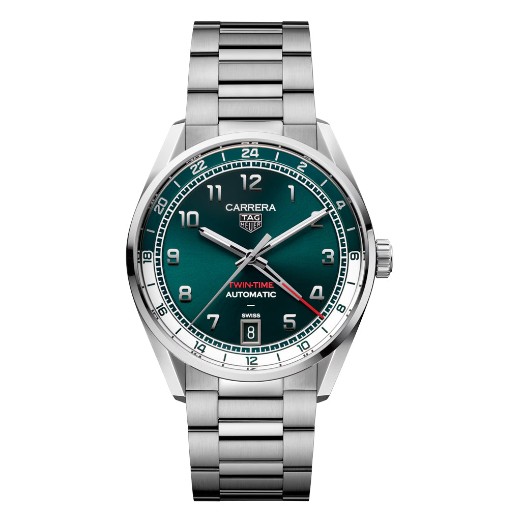 The TAG Heuer Carrera Date Twin-Time completes the 41mm collection, offering a GMT complication in a distinctive teal green. Powered by the TH31-03 manufacture movement, it blends heritage design with modern sophistication.