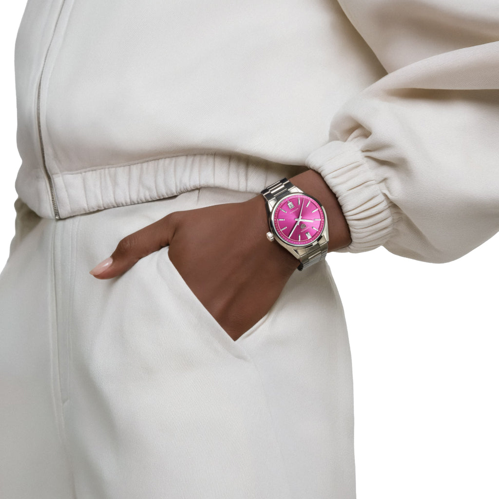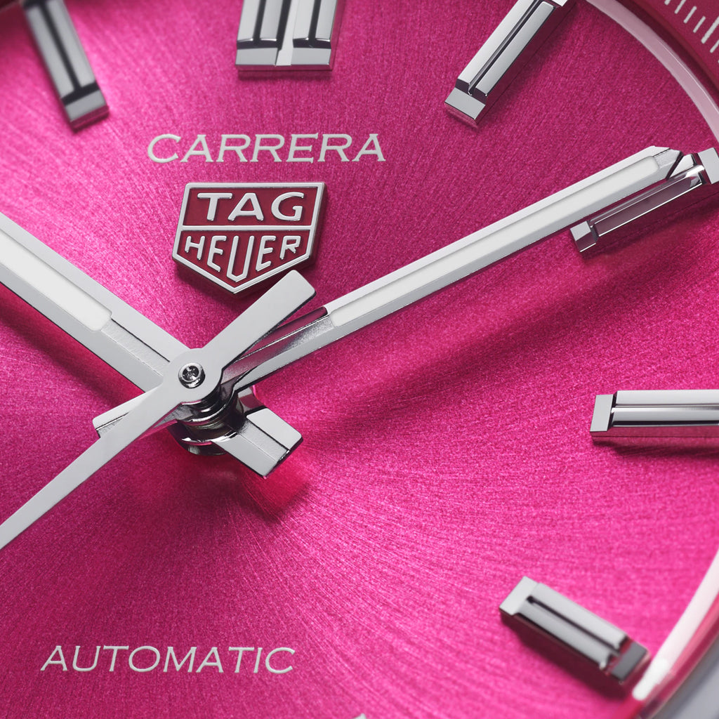 There’s no mistaking the proud and vibrant pink dial of this distinctive TAG Heuer Carrera. Bold and ready to take on any challenge, this striking steel watch reveals the personality of those who dare to wear it. An ambitious icon.