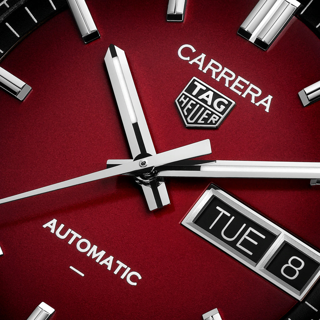 The TAG Heuer Carrera Day-Date in smokey red brings boldness to the collection. Powered by the TH31-02 movement, this eye-catching timepiece elevates timeless design with a modern twist.